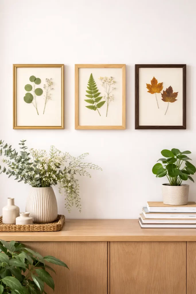 Essas molduras reforçam o aconchego e dialogam com móveis de madeira, paredes em tons quentes e decoração artesanal. O resultado é uma composição que transmite acolhimento e autenticidade, mantendo a folha prensada integrada ao contexto do ambiente.
